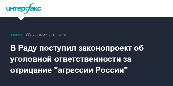 Москва. 28 марта. INTERFAX.RU - Народные депутаты Украины Юрий Чижмарь и Олег Ляшко (фракция Радикальной партии) предлагают ввести уголовную ответственность за публичное отрицание "факта военной агрессии" со стороны стран, которые были признаны агрессорами.