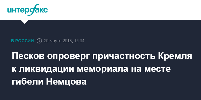 Песков опроверг причастность Кремля к ликвидации мемориала на месте гибели Немцова