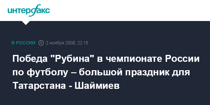 Казань. 2 ноября. ИНТЕРФАКС - Президент Татарстана Минтимер Шаймиев называет победу футбольного клуба "Рубин" большим праздником не только для республики, но и для страны в целом.