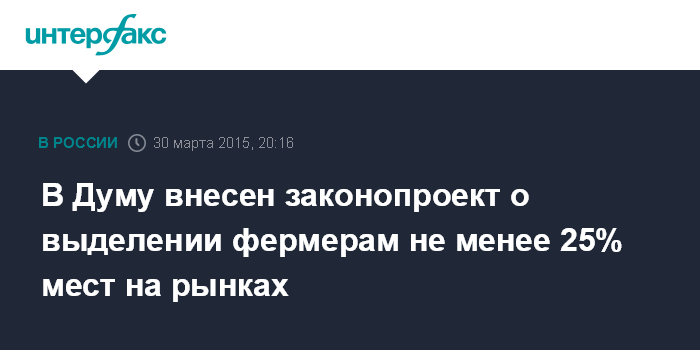 Москва. 30 марта. INTERFAX.RU - Депутаты внесли в Госдуму законопроект, который обязывает предоставлять не менее 25% торговых мест на рынках гражданам, ведущим фермерские хозяйства, личные подсобные хозяйства (ЛПХ) или занимающимся садоводством, огородничеством и животноводством. Текст документа опубликован в электронной базе документов нижней палаты парламента.
