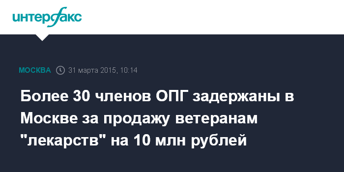 Москва. 31 марта. INTERFAX.RU - Сотрудники полиции задержали в Москве более 30 участников ОПГ, продавших пенсионерам "чудодейственные препараты" на 10 млн рублей, сообщает пресс-служба столичного ГУ МВД России.
