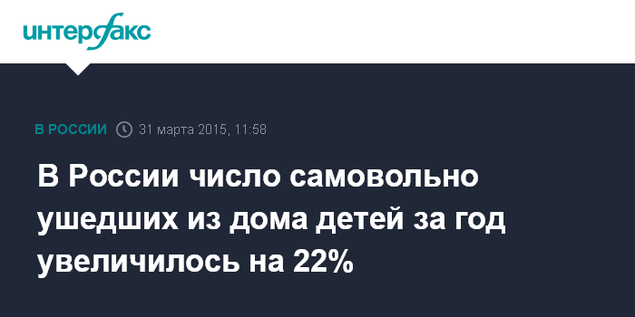 "Тема детей, самовольно ушедших из дома или госучреждений, не просто остается актуальной - положение в этой области у нас ухудшается. Если в 2013 году дети и подростки самовольно покинули дом или государственное учреждение в 41 тыс. случаев, то таких детей в 2014 году - 53,1 тыс. человек. Прирост составил 22%", - заявила Голодец во вторник на заседании правительственной комиссии по делам несовершеннолетних и защите их прав.