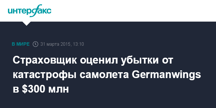 Москва. 31 марта. INTERFAX.RU - Немецкий страховой концерн Allianz оценил катастрофу лайнера Germanwings ("дочка" авиакомпании Lufthansa), произошедшую 24 марта во Франции, в сумму до $300 млн евро (около 275 млн евро), передает Deutsche Welle.