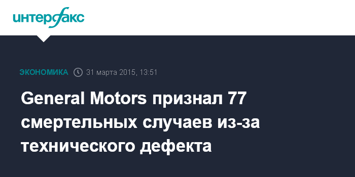 Москва. 31 марта. INTERFAX.RU – В результате аварий, вызванных дефектом в замке зажигания автомобилей американской General Motors, погибли по крайней мере 77 человек, свидетельствуют данные, опубликованные на сайте фонда компании по выплате компенсаций пострадавшим.