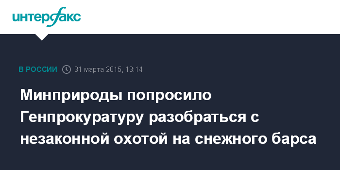 Москва. 31 марта. INTERFAX.RU - Министерство природы РФ просит Генпрокуратуру разобраться с незаконной охотой на снежного барса, занесенного в Красную книгу, обращение также направлено в Интерпол, сообщает пресс-служба ведомства.