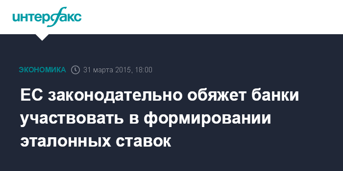 Москва. 31 марта. INTERFAX.RU – Европейский парламент рассматривает законопроект, согласно которому регуляторы смогут потребовать от банков, участвующих в формировании эталонных ставок ("бенчмарков") на финансовых и сырьевых рынках, продолжить предоставлять данные для их определения даже вопреки желанию банков.