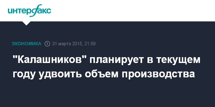 Москва. 31 марта. INTERFAX.RU – Концерн "Калашников" (входит в ГК "Ростех") в 2015 году намерен удвоить объемы производства, сообщили "Интерфаксу" в пресс-службе концерна во вторник.