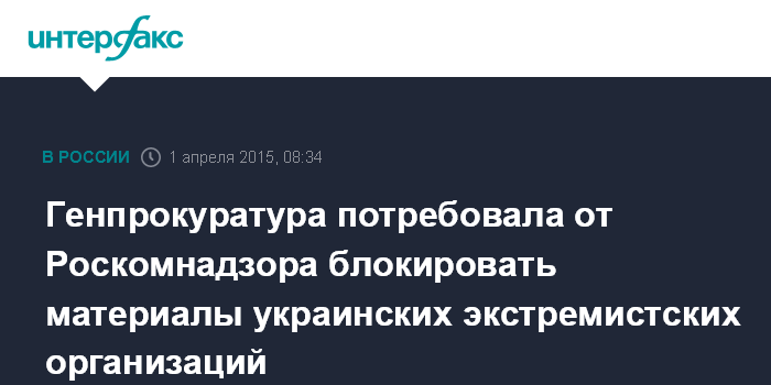 Москва. 1 апреля. INTERFAX.RU – Генеральная прокуратура потребовала от Роскомнадзора запретить публикации в интернете материалов ряда украинских организаций, признанных в России экстремистскими.