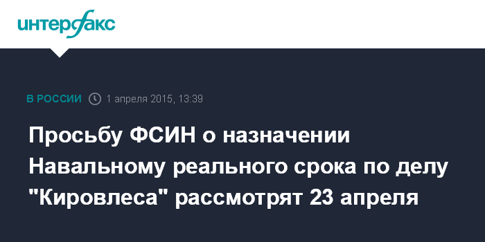 Москва. 1 апреля. INTERFAX.RU - Люблинский суд Москвы 23 апреля рассмотрит представление ФСИН об изменении оппозиционеру Алексею Навальному условного срока на реальный по делу "Кировлеса", сообщила "Интерфаксу"