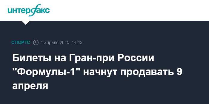 Москва. 1 апреля. INTERFAX.RU - Продажа билетов на российский этап чемпионата мира по автогонкам класса "Формула-1" стартует 9 апреля, сообщила пресс-служба "Сочи Автодрома" в среду.