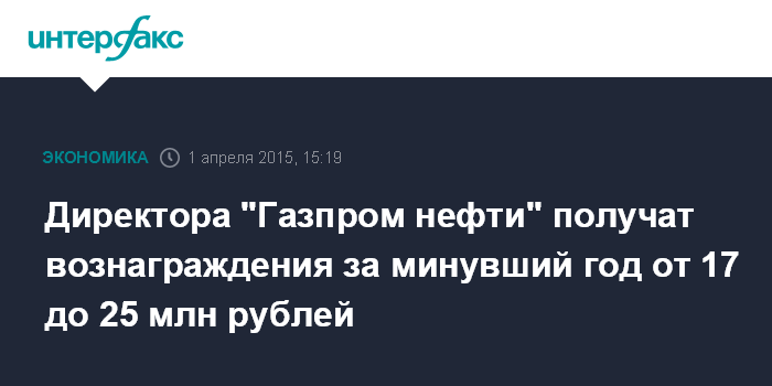 Москва. 1 апреля. INTERFAX.RU – Акционерам "Газпром нефти" на годовом собрании 5 июня предлагается одобрить вознаграждения членам совета директоров за 2014 год в расчете 0,005% от показателя EBITDA по МСФО, говорится в сообщении компании.