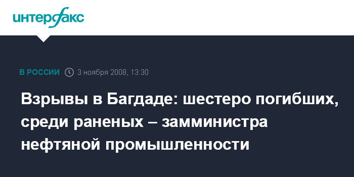 Лондон. 3 ноября. INTERFAX.RU - В результате двух взрывов, одновременно прогремевших в Багдаде, погибли шесть человек, около 20 ранены.