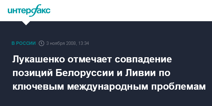 Минск. 3 ноября. INTERFAX.RU - Президент Белоруссии Александр Лукашенко заявил о схожести позиций Белоруссии и Ливии, свидетельствующих о необходимости построения многополярного мира.