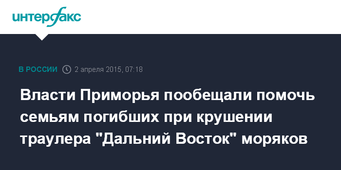 Москва. 2 апреля. INTERFAX.RU - Власти Приморского края уточняют списки моряков из Приморья, находившихся на траулере "Дальний Восток", который затонул в Охотском море.