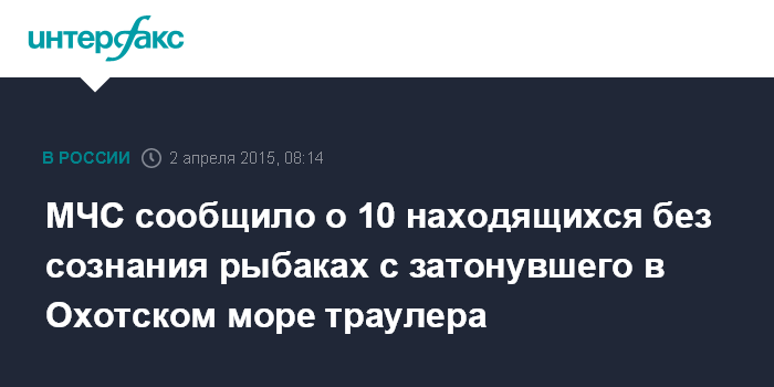 Москва. 2 апреля. INTERFAX.RU – Десять рыбаков, спасенных с затонувшего в Охотском море большого автономного морозильного траулера (БАТМ) "Дальний Восток", по предварительной информации, находятся без сознания, их состояние оценивается как тяжелое. Об этом "Интерфаксу" в четверг сообщил четверг представитель ГУ МЧС России по региону.