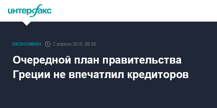 Москва. 2 апреля. INTERFAX.RU - Правительство Греции представило в среду международным кредиторам новый, более детальный план экономических мер, который должен стать основной для выделения Афинам задержанного кредитного транша, необходимого для предотвращения дефолта страны по своим долгам.