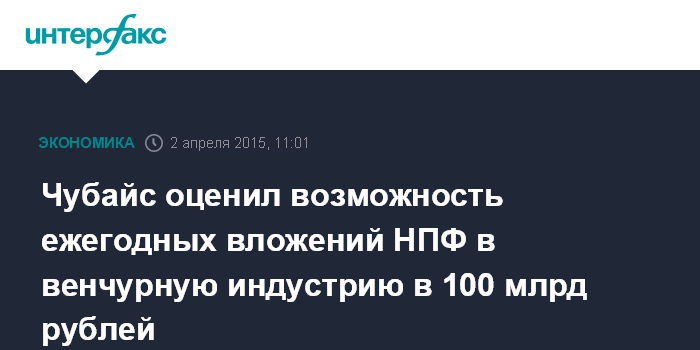 Сейчас объем российских НПФ составляет около 2 трлн рублей: "Даже если 5% этих объемов пойдет в венчурную индустрию, то мы получим вложения в размере 100 млрд рублей", - заявил Чубайс.