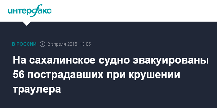 Москва. 2 апреля. INTERFAX.RU - 56 рыбаков, спасенных при крушении в Охотском море большого автономного морозильного траулера (БАТМ) "Дальний Восток", эвакуированы на сахалинское судно "Андромеда", сообщил "Интерфаксу" в четверг представитель ГУ МЧС России по региону.