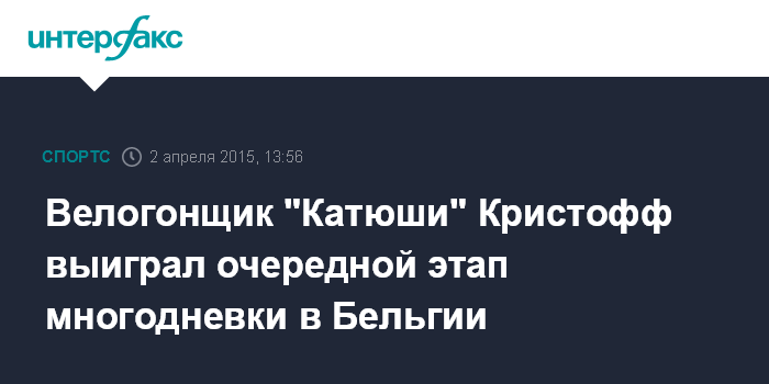 Москва. 2 апреля. INTERFAX.RU - Норвежец Александр Кристофф, защищающий цвета российской велокоманды "Катюша", одержал победу на третьем этапе многодневной гонки высшей категории "Три дня Де Панне" в Бельгии.