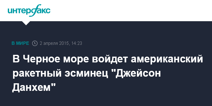 Москва. 2 апреля. INTERFAX.RU - Эскадренный миноносец управляемого ракетного оружия УРО DDG 109 "Джейсон Данхем" войдет в пятницу в акваторию Черного моря, сообщили в четверг "Интерфаксу" в Главном штабе ВМФ России.