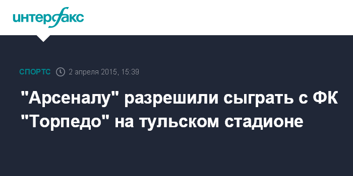 Москва. 2 апреля. INTERFAX.RU - Комиссия РФС по допуску футбольных полей (газонов) для проведения матчей чемпионата и Кубка России разрешила тульскому ФК "Арсенал" провести домашний матч 21-го тура против московского "Торпедо" на своем стадионе в Туле.