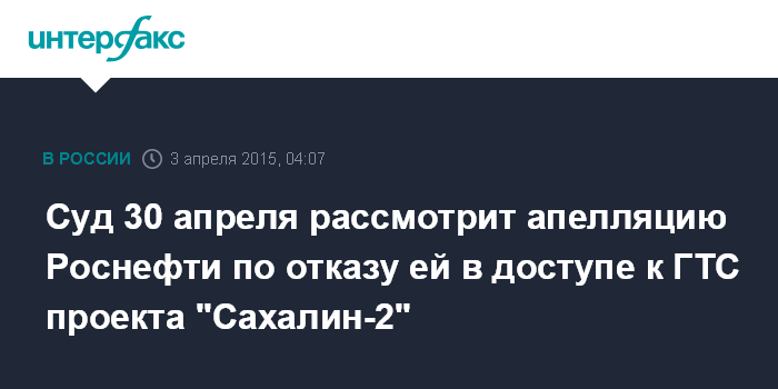 Москва. 3 апреля. INTERFAX.RU - Пятый арбитражный апелляционный суд Сахалинской области 30 апреля рассмотрит апелляционную жалобу нефтяной компании "Роснефть" на решение Арбитражного суда Сахалинской области об отказе в доступе компании к газотранспортной системе проекта "Сахалин-2", сообщается в материалах апелляционного суда.