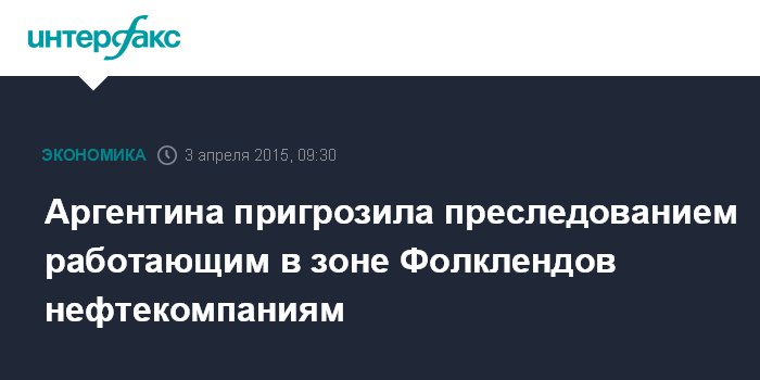 Москва. 3 апреля. INTERFAX.RU – Министерство иностранных дел Аргентины пообещало преследовать в судебном порядке иностранные нефтяные компании, работающие в экономической зоне Фолклендских островов, поскольку считает такую деятельность нелегальным посягательством на аргентинскую территорию, сообщает BBC.
