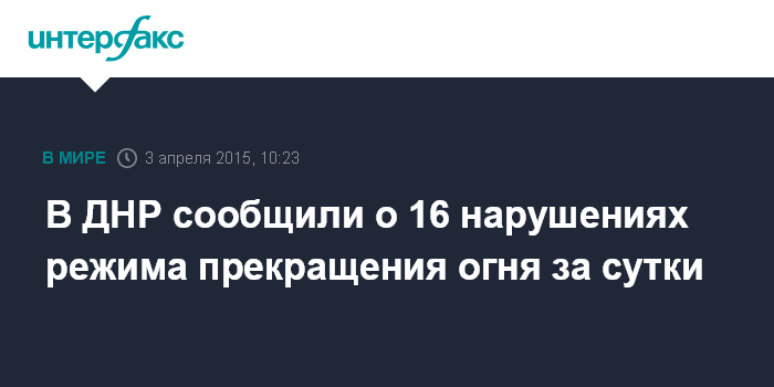 Москва. 3 апреля. INTERFAX.RU - Украинская сторона за минувшие сутки 16 раз нарушала режим прекращения огня, сообщает в пятницу министерство обороны самопровозглашенной Донецкой народной республики, сообщает Минобороны ДНР.