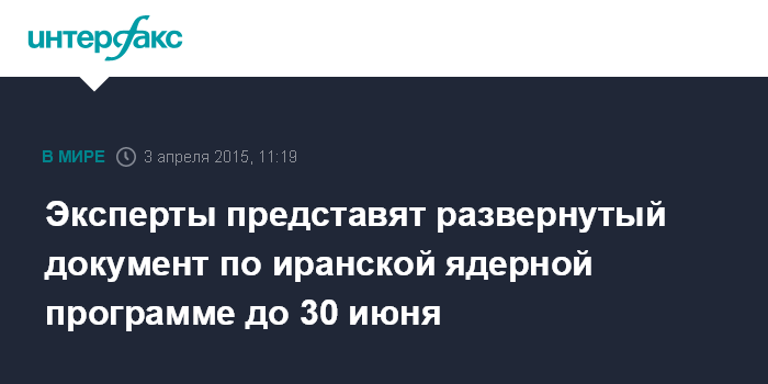 Москва. 3 апреля. INTERFAX.RU - Развернутый документ по иранской ядерной программе будет представлен экспертами до 30 июня текущего года, заявил глава российского МИД Сергей Лавров.