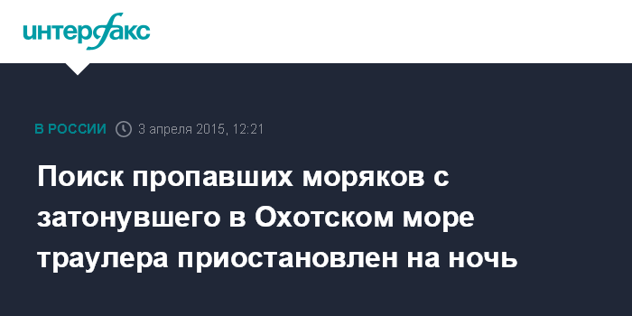 Москва. 3 апреля. INTERFAX.RU - Активные поиски 13 рыбаков, пропавших при крушении в Охотском море сахалинского траулера "Дальний Восток", приостановлены с наступлением темного времени суток.