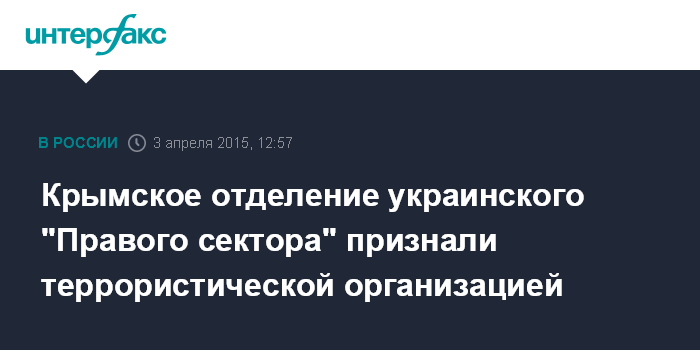 Москва. 3 апреля. INTERFAX.RU - Федеральная служба безопасности России внесла структурное подразделение праворадикального украинского "Правого сектора" на территории Крыма в список террористических организаций, сообщил сайт ведомства.