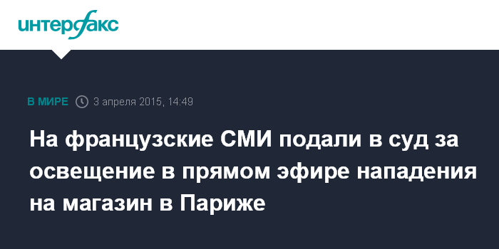 Москва. 3 апреля. INTERFAX.RU - Родственники людей, взятых в заложники в январе во время атаки на кошерный магазин в Париже, подали иск в суд на некоторые французские СМИ за освещение в прямом эфире тех событий, сообщают в пятницу местные издания.