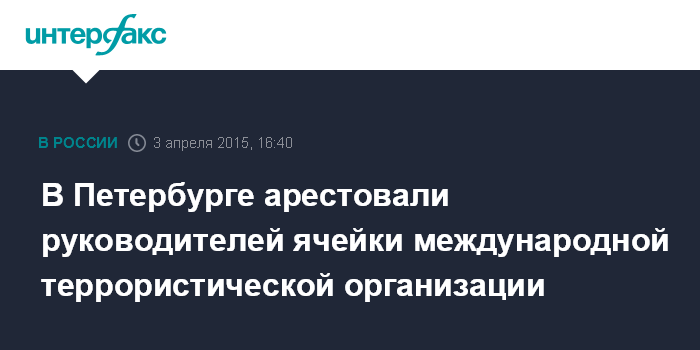 2 апреля сотрудники УФСБ России по Санкт-Петербургу и Ленинградской области совместно с полицейскими петербургского главка задержали двух граждан РФ, являющихся руководителями местной ячейки международной террористической организации "Хизб ут-Тахрир аль-Ислами" ("Партия исламского освобождения").