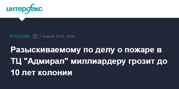 Разыскиваемому по делу о пожаре в ТЦ "Адмирал" миллиардеру грозит до 10 лет колонии