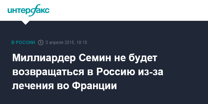 Миллиардер Семин не будет возвращаться в Россию из-за лечения во Франции