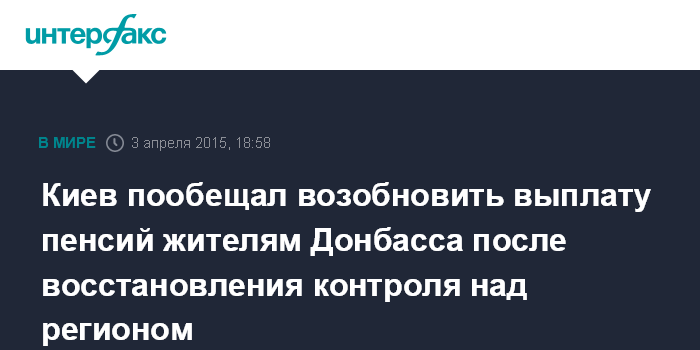 Москва. 3 апреля. INTERFAX.RU - Выплаты пенсий и социальных пособий жителям неконтролируемых украинскими властями территорий Донецкой и Луганской областей будут возобновлены не ранее, чем власти восстановят там свой контроль, заявляет замминистра юстиции Украины Наталья Севостьянова.