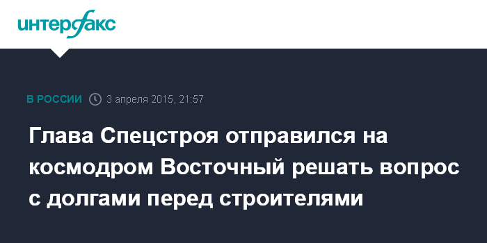 Москва. 3 апреля. INTERFAX.RU - Глава Спецстроя России Александр Волосов вылетел на космодром "Восточный" в Амурской области, чтобы решить проблемы с невыплатой зарплат строителям, задействованным на стартовом комлексе, сообщил вице-премьер Дмитрий Рогозин.