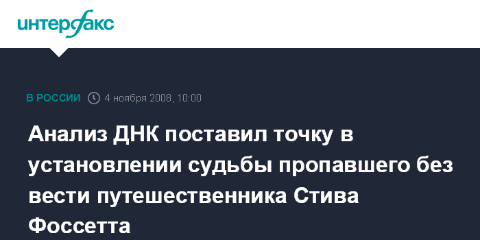 Лондон. 4 ноября. ИНТЕРФАКС - Анализ ДНК найденных в горах Сьерра-Невады останков подтвердил, что они принадлежат путешественнику-миллионеру Стиву Фоссетту, сообщает британская телерадиовещательная корпорация Би-Би-Си со ссылкой на официальное заявление полицейского департамента Калифорнии.