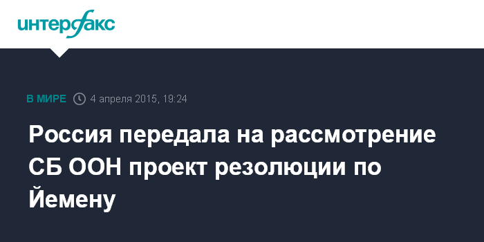 Москва. 4 апреля. INTERFAX.RU - Российская сторона передала на рассмотрение Совбеза ООН проект резолюции по Йемену, в котором говорится о необходимости организации там "гуманитарной паузы", сообщает в субботу телеканал "Аль-Арабийя".