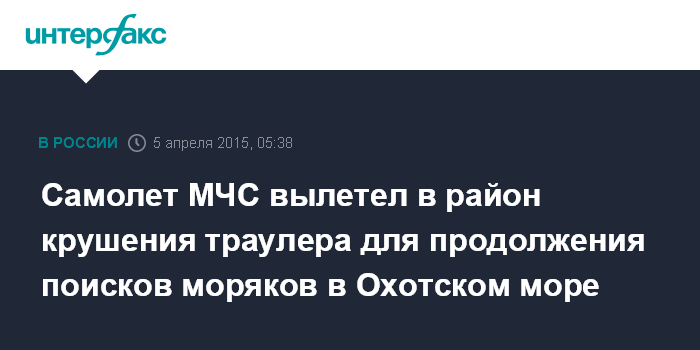 Москва. 5 апреля. INTERFAX.RU - В районе кораблекрушения траулера в Охотском море в воскресенье продолжился поиск 13-ти рыбаков с воздуха - из Магадана вылетел самолет Бе-200 для проведения поисково-спасательных работ, сообщает Дальневосточный региональный центр МЧС РФ.