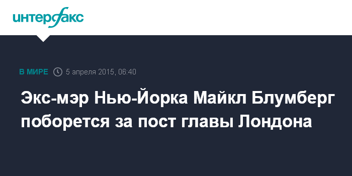 Москва. 5 апреля. INTERFAX.RU - Бывший мэр Нью-Йорка Майкл Блумберг может выставить свою кандидатуру на пост мэра британской столицы, сообщает The Sunday Times . Выборы главы Лондона намечены на май 2016 года.