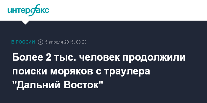 Москва. 5 апреля. INTERFAX.RU - В спасательной операции по поиску пропавших моряков траулера "Дальний Восток" задействовано более двух тысяч человек, сообщает пресс-служба МЧС России.