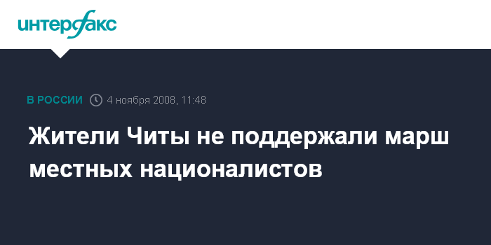 Москва. 4 ноября. INTERFAX.RU -Марш местного отделения "Союза русского народа", прошедший во вторник в Чите, не вызвал энтузиазма у жителей города.