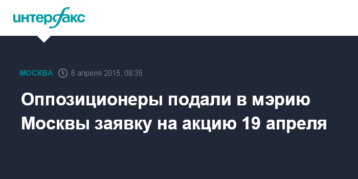 Москва. 6 апреля. INTERFAX.RU - Оппозиция в понедельник утром передала в мэрию Москвы заявку на проведение 19 апреля протестного шествия и митинга.