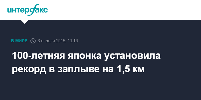 Москва. 6 апреля. INTERFAX.RU - Подданная Японии Миэко Нагаока стала первым жителем Земли старше 100 лет, сумевшим проплыть 1,5 тыс. м в свободном стиле, сообщают японские СМИ.