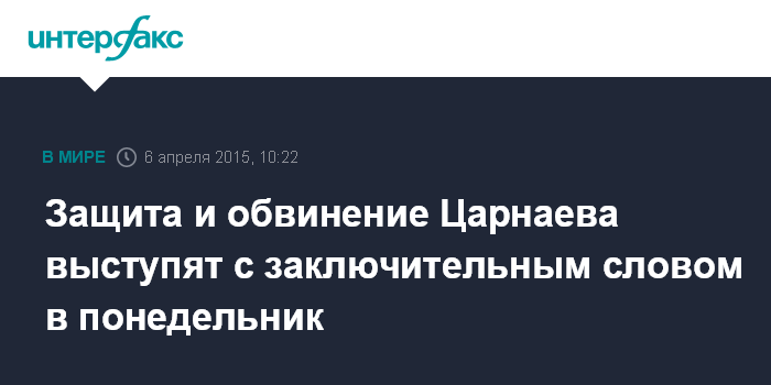 Москва. 6 апреля. INTERFAX.RU - Стороны защиты и обвинения Джохара Царнаева в понедельник выступят с заключительным словом, пишут американские СМИ.