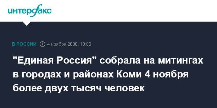 Москва. 4 ноября. INTERFAX.RU - "Единая Россия" собрала на митингах в городах и районах республики Коми в честь Дня народного единства во вторник более двух тысяч человек, сообщили "Интерфаксу" в региональном отделении партии.