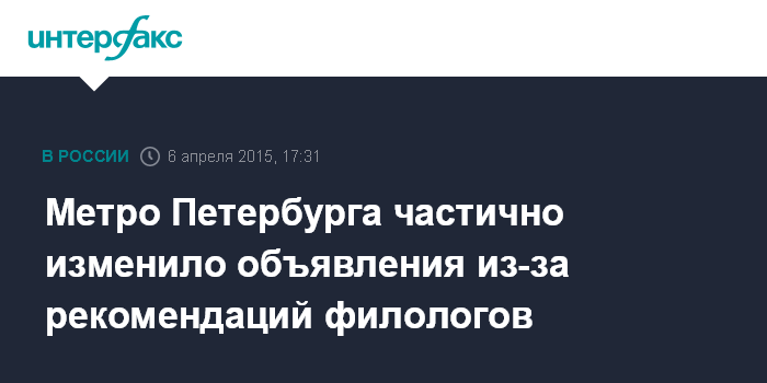 Москва. 6 апреля. INTERFAX.RU - Петербургский метрополитен учел некоторые предложения филологов и скорректировал голосовые объявления, которые своими неблагозвучными формулировками не нравились горожанам.