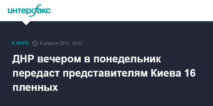 Москва. 6 апреля. INTERFAX.RU - Самопровозглашенная Донецкая народная республика вечером в понедельник передаст украинской стороне 16 пленных, сообщил "Интерфаксу" источник в комитете ДНР по военнопленным.