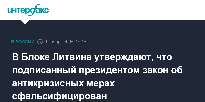 Москва. 4 ноября. INTERFAX.RU - В Блоке Литвина утверждают, что подписанный президентом Украины закон об антикризисных мерах сфальсифицирован и обвиняют в сговоре руководство парламента и правительства.